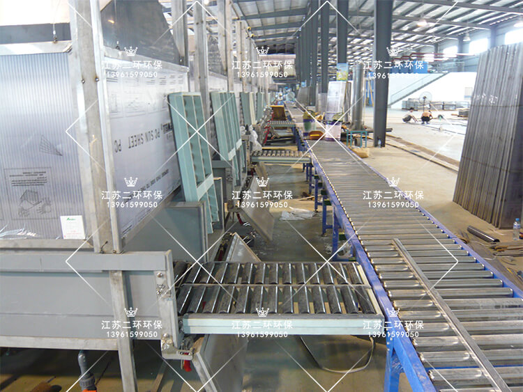 電池化成線,又稱為電池外內(nèi)化成酸霧回收裝置。電池內(nèi)化成充電過程中,加酸通電發(fā)生化學(xué)反應(yīng),生成鉛氧化物活性物質(zhì)。整個(gè)系統(tǒng)有酸槽、酸霧吸罩,酸霧風(fēng)管、酸霧凈化塔構(gòu)成。類似酸洗槽、磷化槽、電解槽裝置。