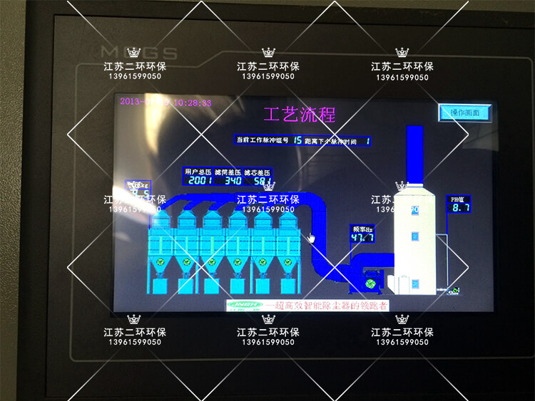 除塵器加裝了相關檢測的儀器儀表、通過PLC程序控制自動運行,通過觸目屏展示。
