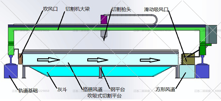 4、移動(dòng)的行程導(dǎo)軌一側(cè)安裝抽風(fēng)管道,并有相應(yīng)的風(fēng)門調(diào)節(jié),在哪個(gè)點(diǎn)切割時(shí),對(duì)應(yīng)該點(diǎn)的風(fēng)閥打開,通過(guò)管道連接除塵器抽走煙塵。